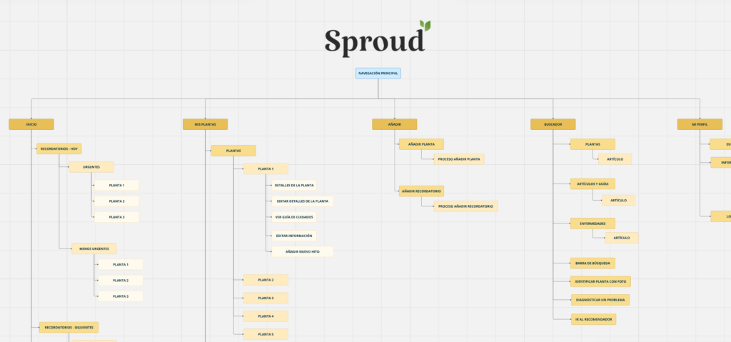 I used the Miro tool to create the outline of the app’s flow of use to see in a more simplified way the different processes that the user performs and to be able to better adjust the depth of clicks that the user has to make to reach certain actions.
