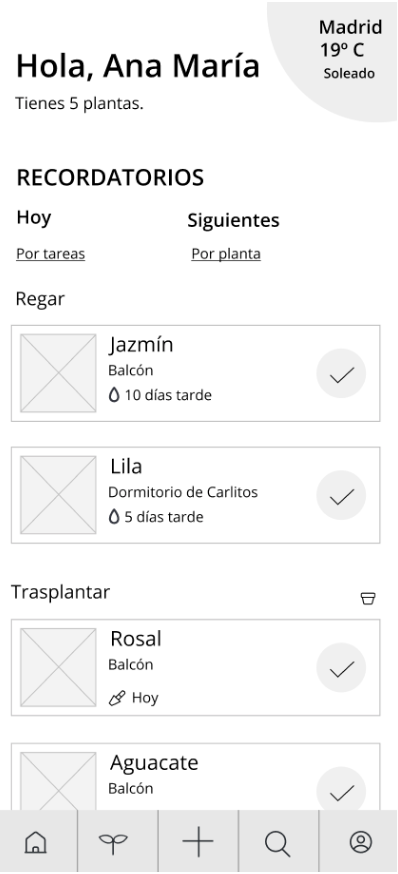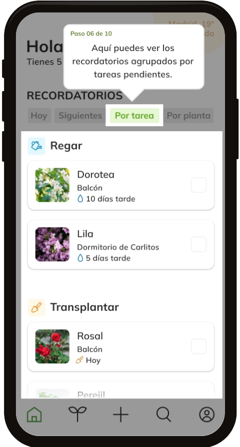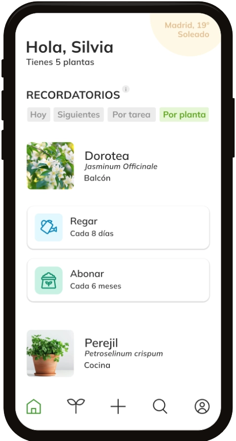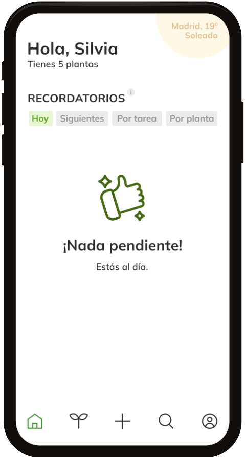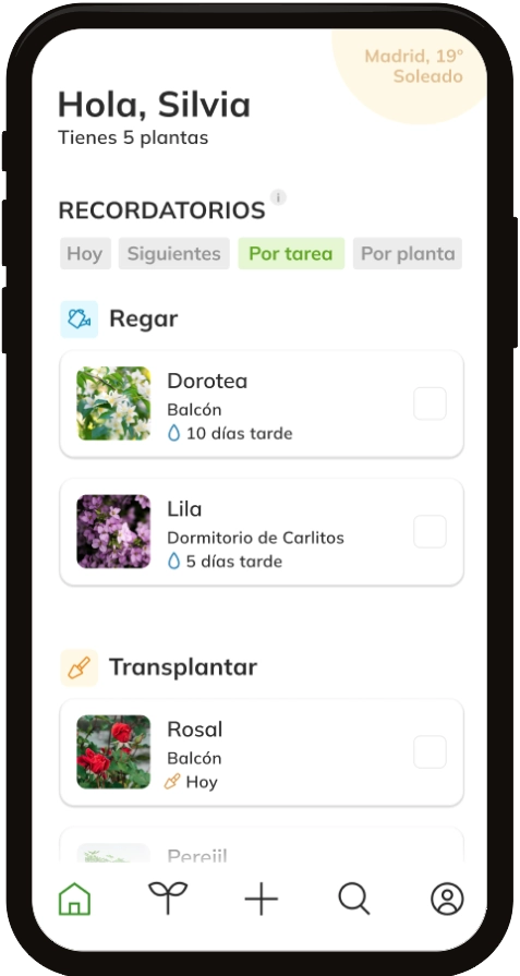 Home shows the active reminders, which can be filtered by proximity in time, by specific task or by plant. When the user has completed one of the pending tasks (such as watering, fertilising, transplanting or pruning), it is marked as completed with a check.
