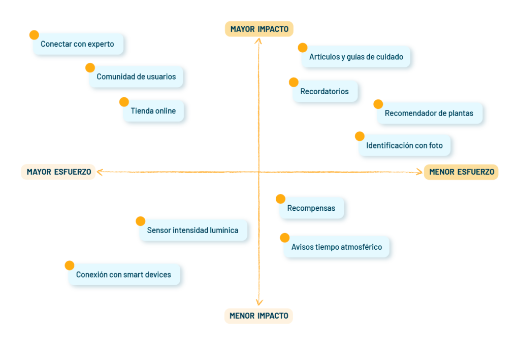 Once I had defined all the characteristics that could add value, I put them into an impact-effort priority matrix. In this way, I was able to get a clearer idea of which ones might be most viable.