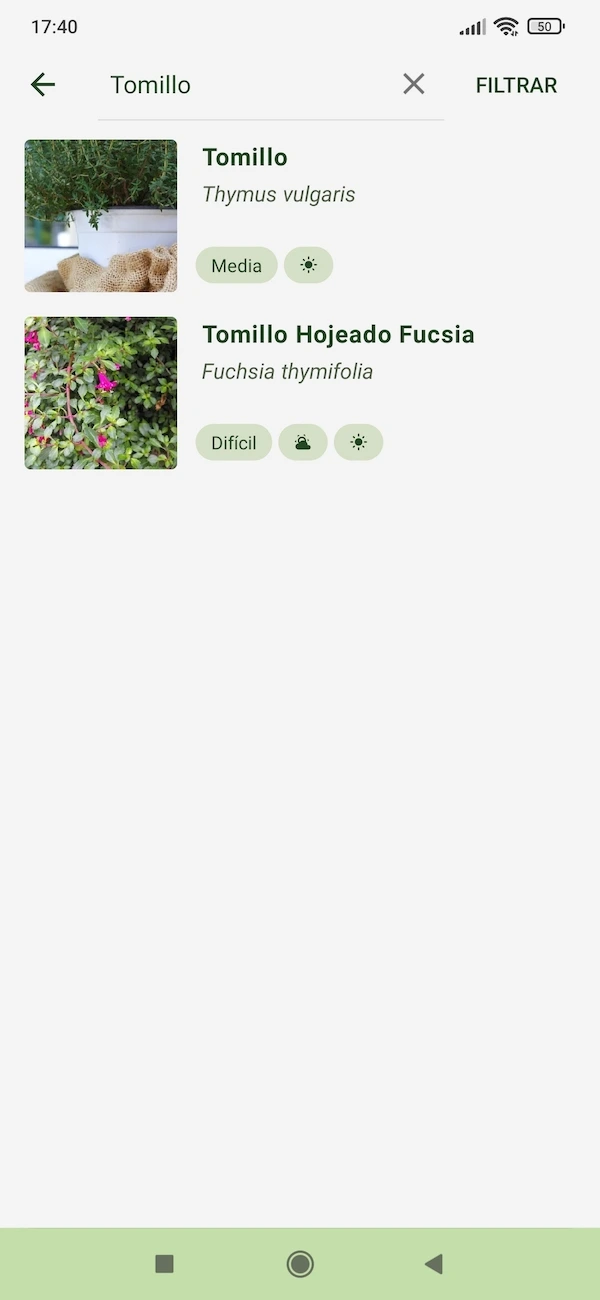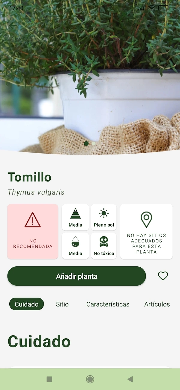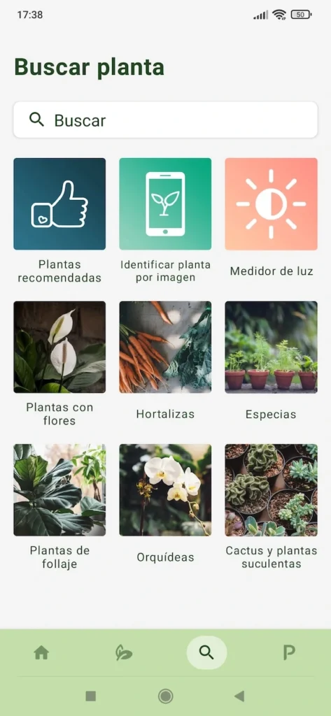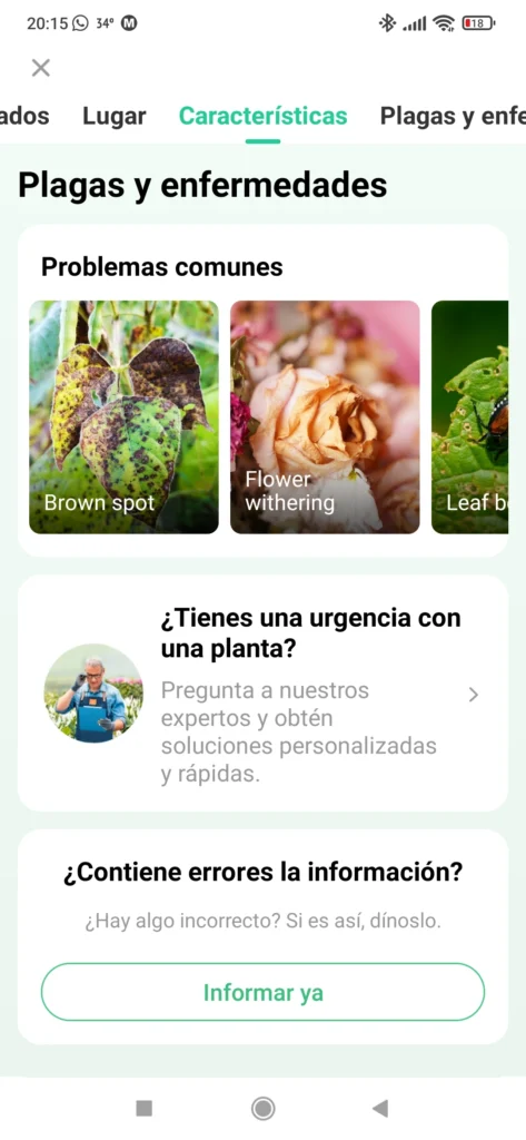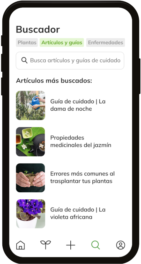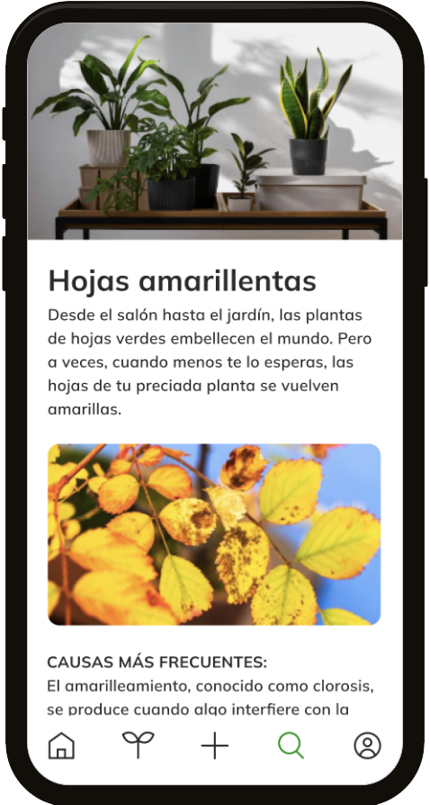 Sproud includes a search engine to answer users’ questions. The results are classified into Plants (with the basic information sheets for each one), Articles and care guides (with more detailed information about some characteristic or interesting aspect of the world of plants and plant care) and Diseases (how to identify and solve problems and pests).