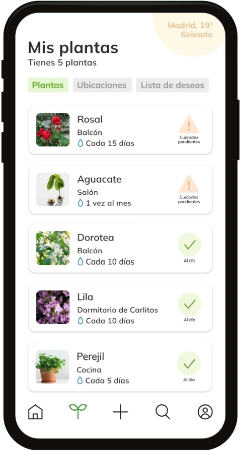 In ‘My plants’ area, the user can quickly see the main information about all his plants: if there are any pending tasks, where they are located, the ones he has saved in his Wish List to acquire them later.