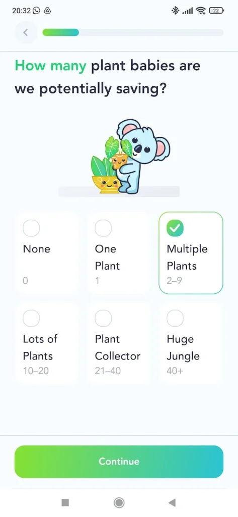When starting to use Sproud for the first time, the user goes through the initial setup, where he/she has to answer a few short questions to inform about his/her preferences and skill level with plants (the app will adapt the plant recommendations depending on the level indicated by the user, which can be changed later on).