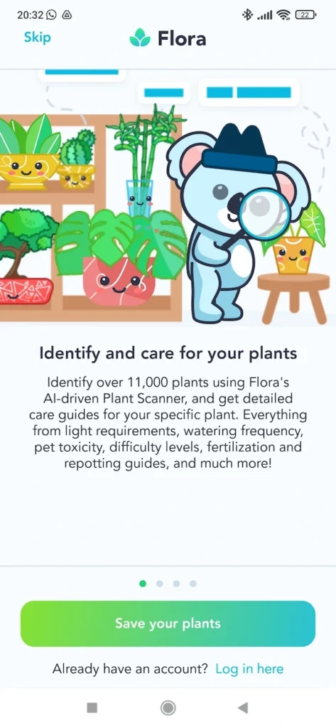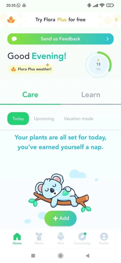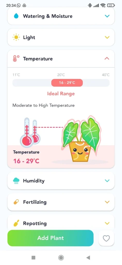 Very user-friendly (it has several cute-looking characters or mascots, many text boxes and pop-ups with clear and easy-to-understand instructions appear continuously). It has a Community area where users can share photos of their plants.