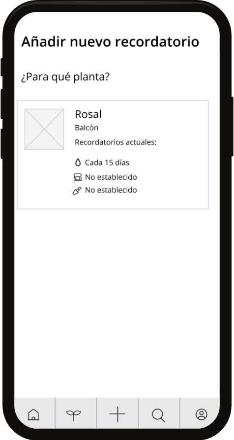The main panel the user reaches when opening the app, the ‘Home screen’. From here the rest of the main navigation areas are accessed: My plants, Add, Search and My profile.
